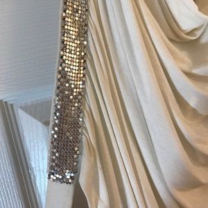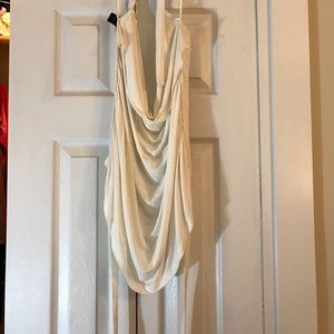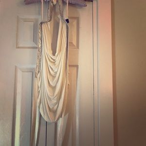 Completely backless. Ties at neck and ties at bottom. Never worn! It's a juniors XL but it's meant to be loose and the back is open I would say it would fit a medium to large frame as well.