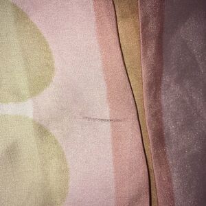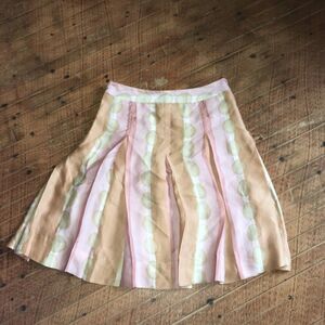 Lined silk skirt with pink and tan stripes. In good, used condition, one small mark on the back that’s not too noticeable. Approximately 14 inches across the waist, 21 inches long. From a pet and smoke free house. Happy to bundle!