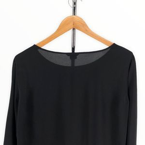 Black silk semi sheer blouse, with embroidered eyelet detailing at hem and cuffs of sleeves, wider scoop neckline.
