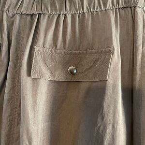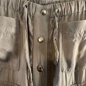 Featuring snap button detail to front of skirt, 4 cargo pockets to the front, two pockets in the back, with elasticized drawstring waist, elastic hem, unlined, all in a silky smooth beautiful green material.