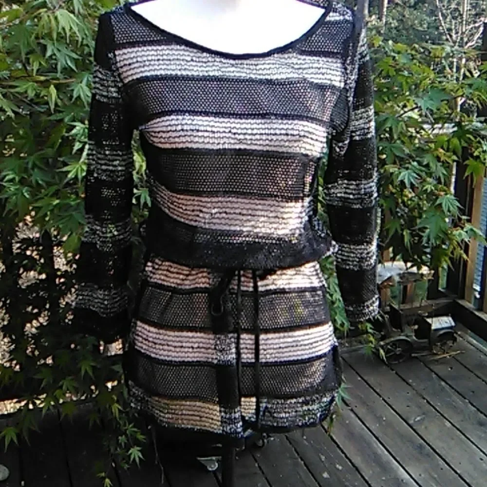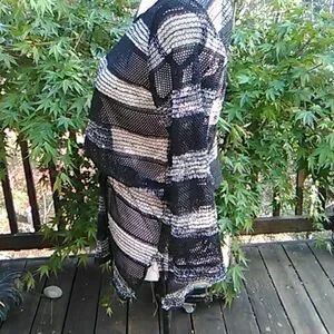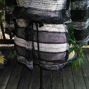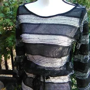 Loose crochet in black and silver stripes. Drawstring at the waist. Bracelet length sleeves. Perfect over a tank, Cami, or swimsuit. Size small measures 38 at chest, 34 at drawstring waist, 38 at bottom curved, vented hem. Sleeves 20. Sheer so that whatever you're wearing underneath shows through. a great accent piece or cover up.