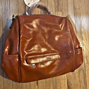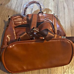 A rich, warm cognac brown leather backpack with a smooth, glossy surface and a flap closure.