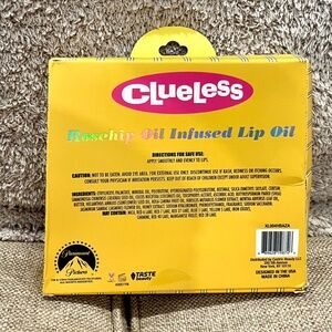 Clueless themed Rosehip Oil Infused Lip Oil Set of 4 Taste Beauty Clueless Rosehip Oil Infused Lip Oil Set. The set includes four flavored lip oils: cherry, lemon, peppermint, and strawberry. The lip oils are infused with rosehip oil and vitamin E to hydrate and condition lips.