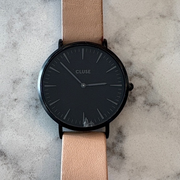 Cluse watch featuring a sleek black dial and a tan leather strap. Minimalist design for everyday elegance. Water resistant. Needs battery. Small chip in face.