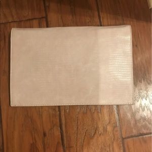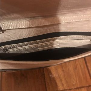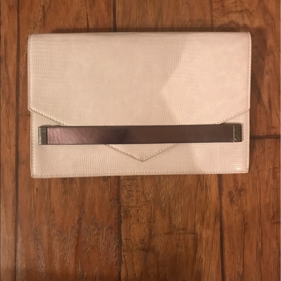 Zara clutch like new. Has a detachable shoulder strap. Color is like a very light grey or a cool toned off white. The flap goes underneath a gunmetal color strap. Super cute for all year round!!