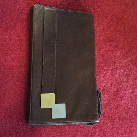 Brown and tan leather shoulder bag. Multiple pockets inside and one outside.