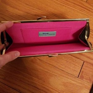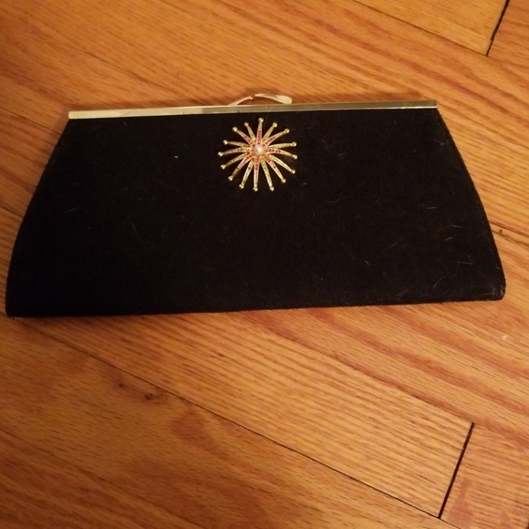 Black cloth clutch with gold clasp, pink and green stone detail
