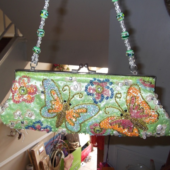 Green clutch with little beads and butterflies.