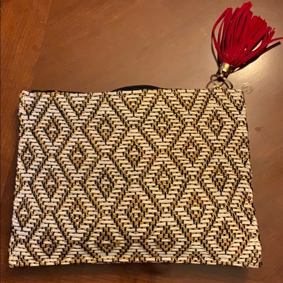 Exquisite handmade clutch with a durable zipper with red sassy tassel.It measures 7 1/2 inches tall and 10 1/2 inches long