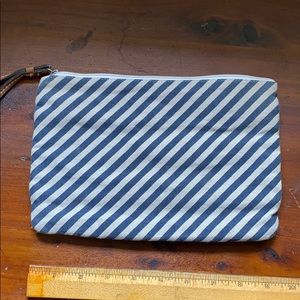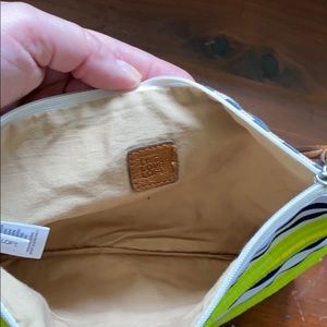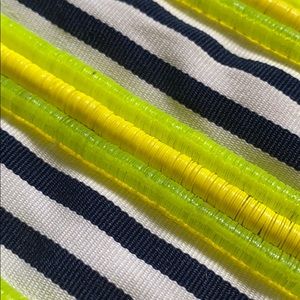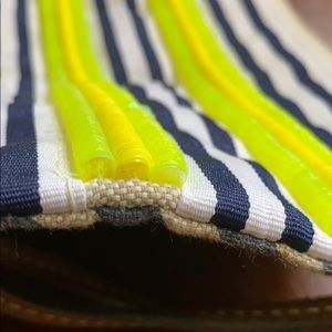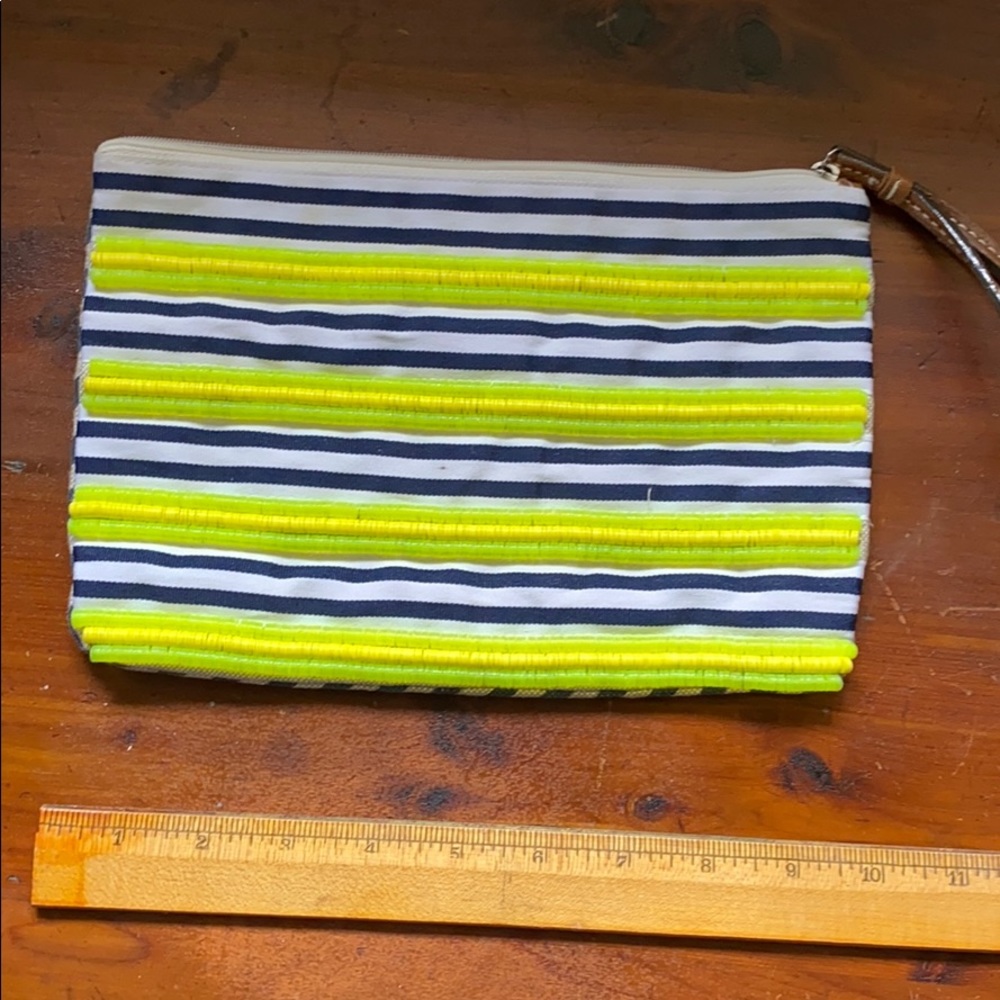 Yellow and navy fabric wristlet. Small plastic yellow disc pattern.