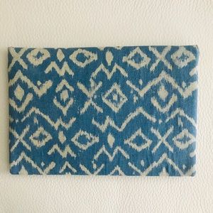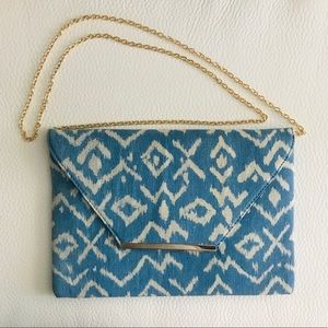 Blue and off white tribal print clutch with gold metal strap