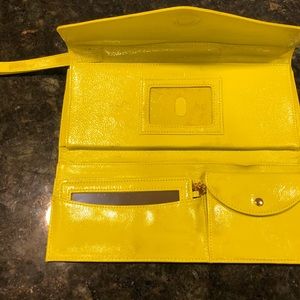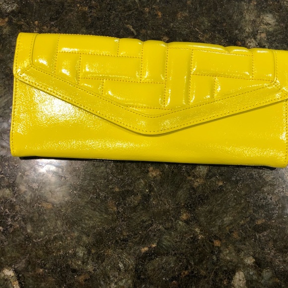 Chartreuse clutch with wrist strap. Has a matching mirror. Has subtle discoloration reflected on second picture.