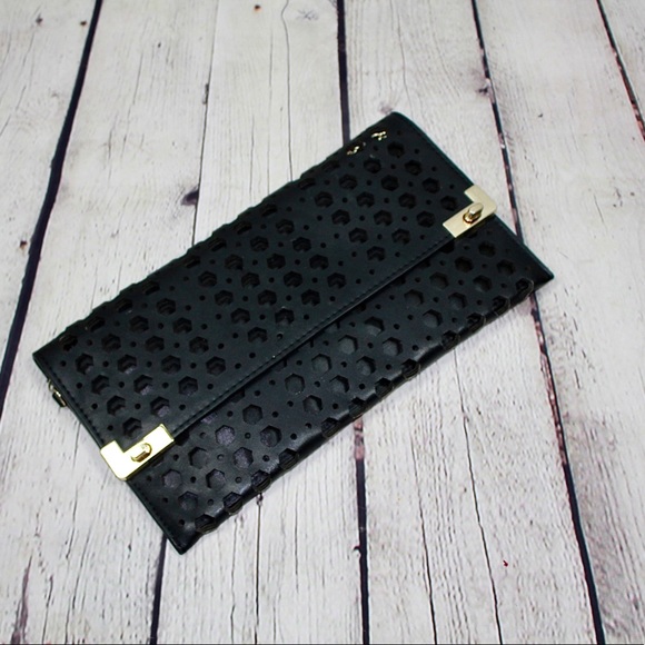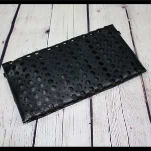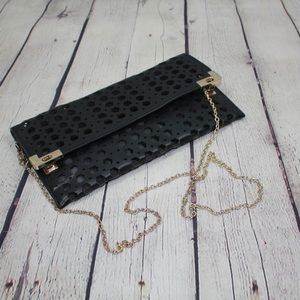 In excellent condition, worn only once, faux leather clutch with original details and metal strap. Measurements: Length 11” height 6”