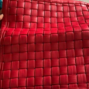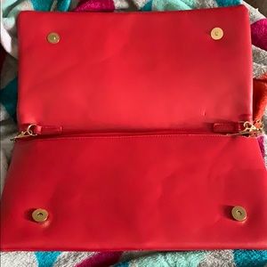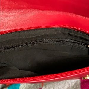 Red clutch with removable gold chain. Can be worn around your arm or across the body. Inside has a small zipped compartment and can hold a purse, lip gloss, small hand sanitizer or lotion bottle. The purse zips and snap to close.