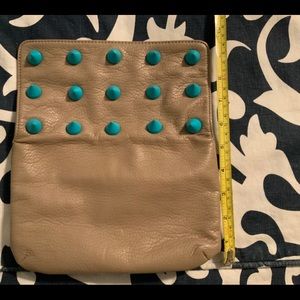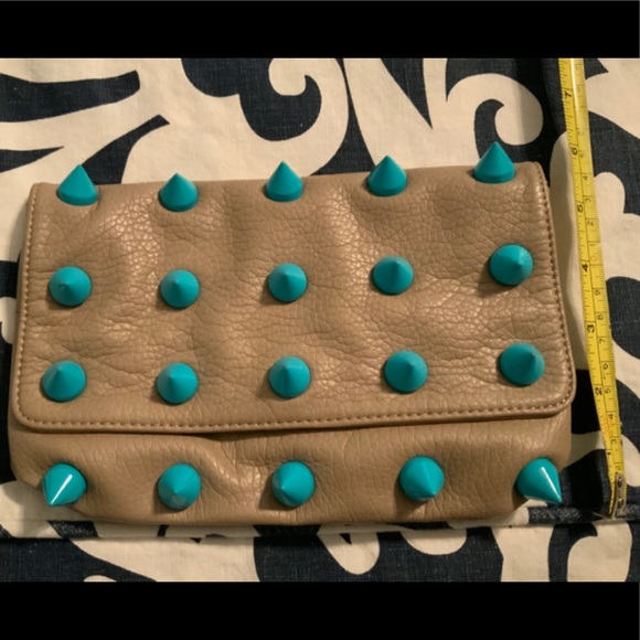 deux lux gray leather blue spikes. Magnet closer. If you add a chain you can use it as a crossbody. Great condition