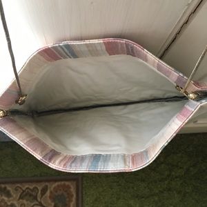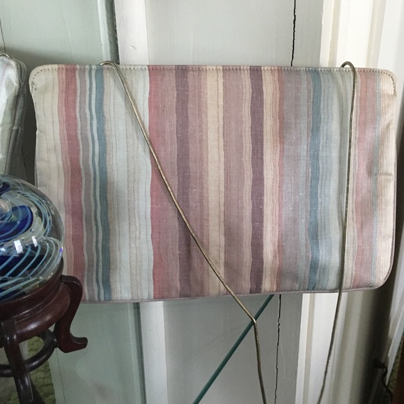 Cloth clutch with optional chain. Both sides are striped with muted brown, beige, plum, old rose, blue and sea foam green. Size is 10x6 1/2x4 1/2 and 121/2 chain. Spring opening holds purse open to see contents. Stain has lost its luster in places.