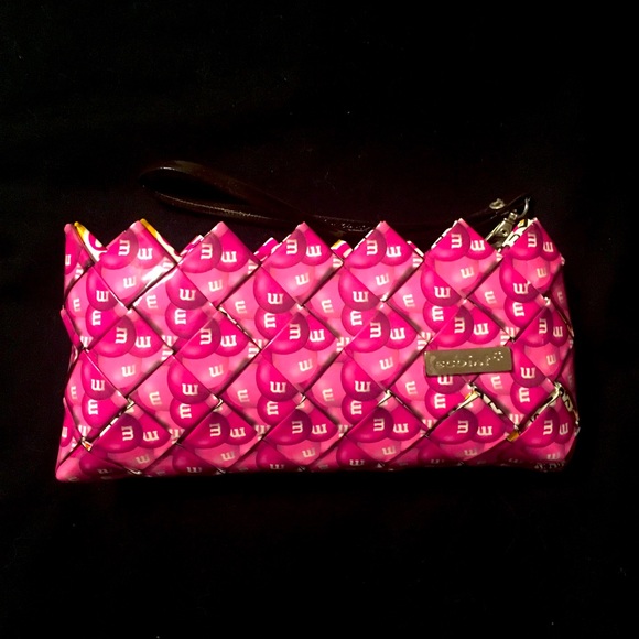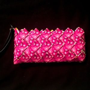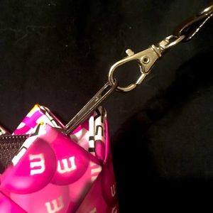 Supporting Breast Cancer - made from recycled material. Fun whimsical clutch with m&m exterior design measuring 8” x 3.5”. Zipper closure with removable strap.