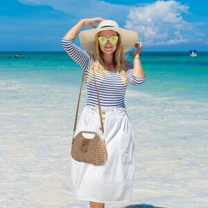 Features: Stylish straw clutch with a structured design that transitions seamlessly from office to happy hour. Features an adjustable strap for comfortable wear, a twist lock closure for easy access, and enough room for your essentials like phone, wallet, and cosmetics. Handwoven from sustainable straw with double-stitched bamboo edges for durability—perfect for eco-conscious shoppers.