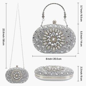 PERFECT SIZE -----The crystal clutch purse external dimensions: 8"L x 5.5"H x 2.3"W, Internal dimensions:7.2"L x 4.7"H x 2"W. Weight:0.9 LB. One detachable metal shoulder O chains Length-47.24",silver metal handle height 3.7".It is a small bag.Please refer to the size. confirm purchase.