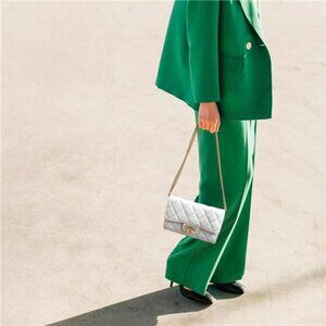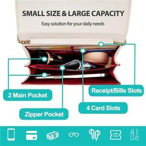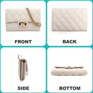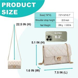 The purse crossbody is Made of 100% vegan PU leather, which is wear-resistant, scratch-resistant, and easy to clean (just wipe with a damp cloth). The interior is lined with wear-resistant fabric and comes with a reinforced anti-theft clasp and a gold - colored chain strap.