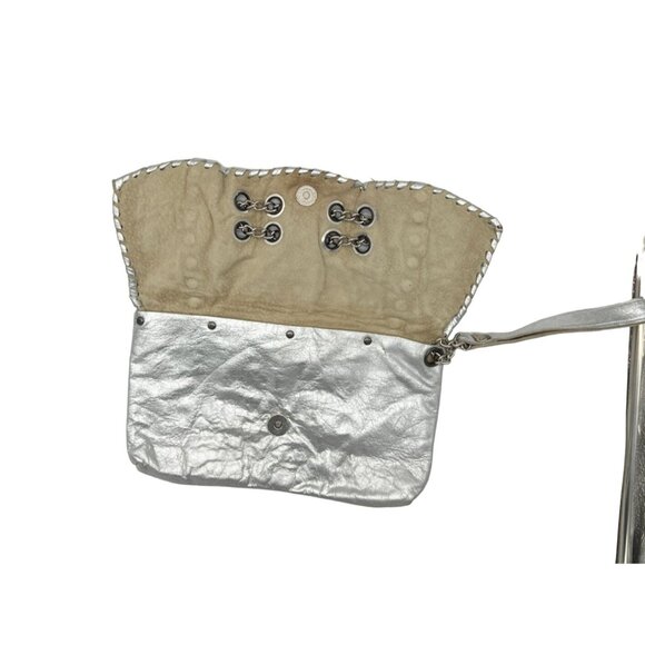Tags: silver clutch, metallic wristlet, grommet bag, chain detail purse, rocker chic clutch, studded clutch, edgy handbag, festival bag, party purse, evening bag, foldover clutch, statement wristlet, silver faux leather bag, Y2K clutch, glam rock style, chain accent handbag, night out accessory, bold metallic purse