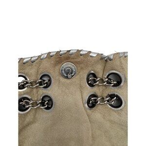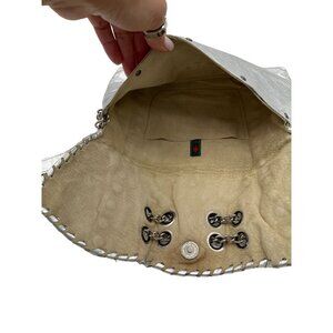 Turn heads with this edgy silver metallic clutch wristlet featuring bold grommet and chain details. Designed with a foldover flap, stud accents, and detachable wrist strap, this statement bag combines rocker-chic style with practical functionality. Perfect for nights out, concerts, festivals, or adding a touch of shine to any outfit.