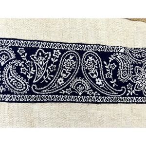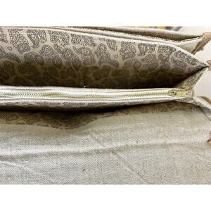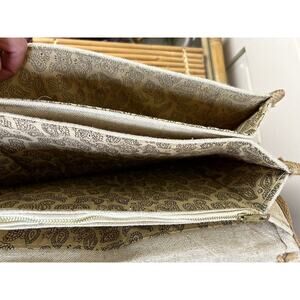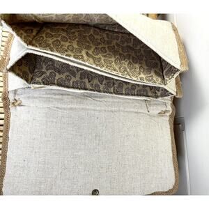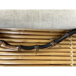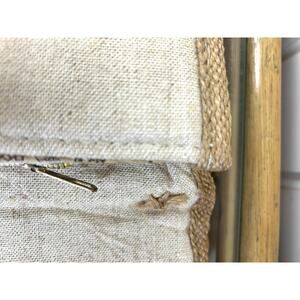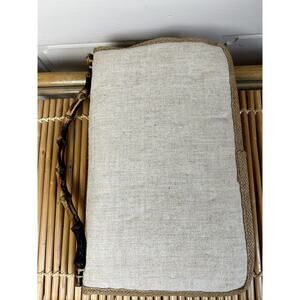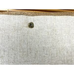 Clutch summer handbag (14” wide x9” tall). Material is a light tan tweed/linen with a navy blue bandanna accent. Interior has five compartments ( one with a zipper), very clean…beautifully made, bamboo handle…no stains.