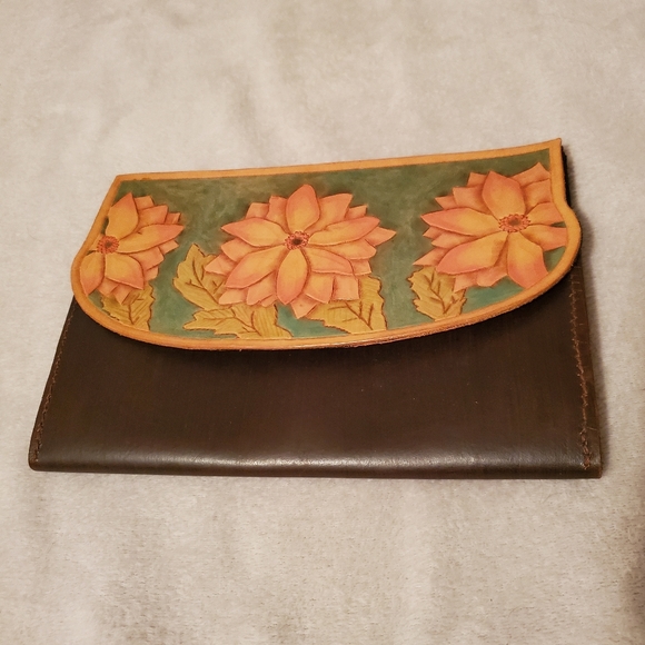 Very unique handmade 100% genuine leather floral clutch/Wallet. Beautiful colors of pink, turquoise, and olive green.