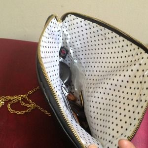 You can wear it as a clutch, or a purse. Black and white picks dots in side. Folded flop. Cross-body chain. Note you can take off chain and wear as a clutch. You can keep chain and wear as a cross body purse or you can wear as a shoulder purse. Fits Keys, makeup, phone etc.