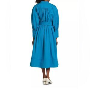 Complete with a tonal self-tie belt, this pleated long-sleeve midi-dress is finished with a structured band collar and dramatic barrel button cuffs.