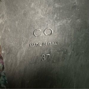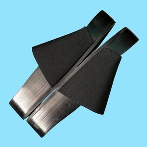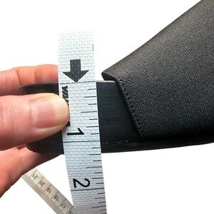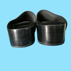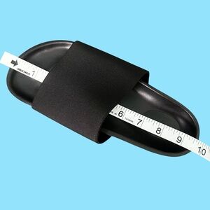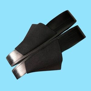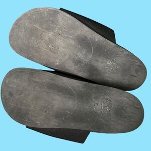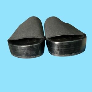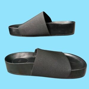 The sandals are Co. black elasticated slide sandals. They feature a wide, stretchy knit fabric upper strap and a chunky platform sole, often described as a flatform.