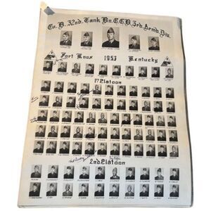 Co. B 32nd Tank Battalion C.C.B. 3rd Armored Division 1953 Photos. Fort Knox Kentucky 1st, 2nd, 3rd & 4th Platoon photos. 2 14” x 11” team photos. 1st Platoon has some signatures. Photos have some creases and wear. Come on folder from the Post Studio.