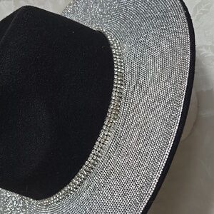 Black rhinestone trimmed hat. This is stunning and definitely unique. Will get you tons of compliments. Country, festival or a night out. Good condition but edge of back brim looks like maybe edgoe of rhinestones are missing but also looks like made that way. See pic