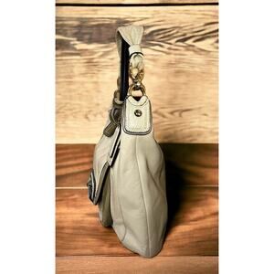 This Coach 16803 Kristin Spectator Leather Hobo Bag from 2010 is a classic Coach silhouette. Featuring soft off-white leather with taupe and snakeskin embossed trim, this is the perfect Spring and Summer bag. Not only stylish, but functional with exterior storage, as well as several internal pockets. If you love and appreciate Coach design and quality, this is a must have for your collection!