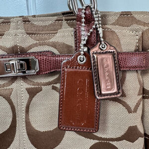 Coach Chelsea Signature Jayden Carryall, style number 17806M. The bag is trimmed, belted, and framed at the corners with lizard-embossed leather. Includes two Coach hang tags. Original clear sticker intact on the silver hardware on the belt. It has a chain detail at the handles. The interior is split into three compartments and has inside zip, cell phone, and multifunction pockets. The handles have an 8” drop. Excellent condition - no stains or damage noted to the exterior. Inside has a couple very small ink marks as shown.