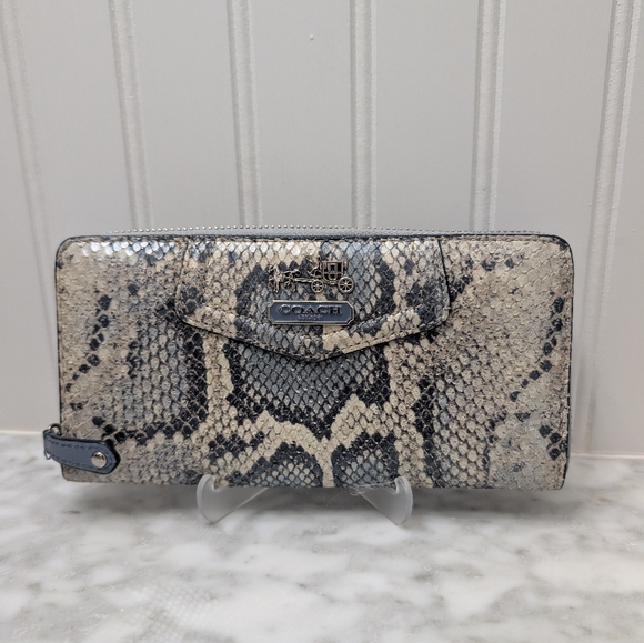 Limited edition 1941 Collection Coach python wallet with pretty blue accents. Like-new condition with no marks, scuffs, or stains. There's no wear or exposed piping, and the zippers are zippy. The inside is totally clean with no coin residue or dust. Comes with an unbranded dust bag. 10/10