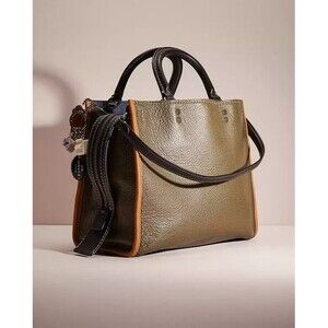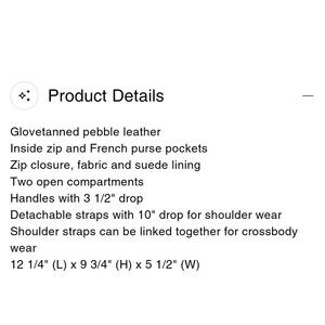 Details Quilted nappa leatherInside zip and French purse pocketsZip closure, fabric and suede liningTwo open compartmentsHandles with 3 1/2" dropDetachable straps with 10" drop for shoulder wearShoulder straps can be linked together for crossbody wearCompatible with Coach interchangeable straps12 1/4" (L) x 9 3/4" (H) x 5 1/2" (W)