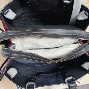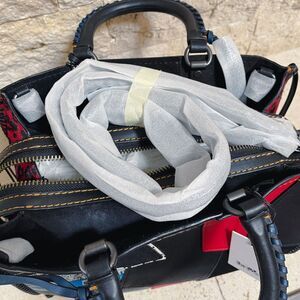 Coach 1941 Rogue 30 Embellished Patchwork Whipstitch Mixed Leather Bag in Red Multi. Features black natural pebble leather, glove tanned smooth leather, animal print sides, center zip closure between two open compartments, inside zip and french purse pockets, fringe studded detail zipper pulls, braided handles with 3.5" drop, optional shoulder crossbody strap with 10" drop, four feet on bottom. Style 58159. NWT / New with tags. Never been carried or used.