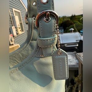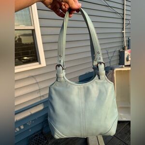 Gorgeous 1993 ice blue Coach shoulder bag with Coach tan signature patterned interior. Some small Light marks are on the exterior of the purse, but are all shown in pictures. Please let me know if you have questions. Beautiful interior!
