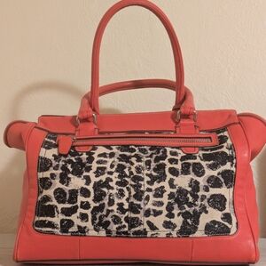 Coach 19989 Legacy Haley Red Leather and Leopard Print Satchel is stylish and spacious. Excellent condition. Made with red leather and featuring a bold leopard print pattern, this large satchel exudes a trendy and fashionable appeal. The bag includes a zip closure, tassel accents, and silver hardware for a touch of elegance. The interior is lined with fabric and boasts a beige color, providing a clean and organized space for all your essentials. Perfect for adding a touch of animal print to your outfit. 11" h x 14" w. Original price: $455.00.