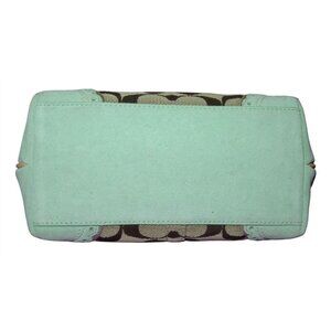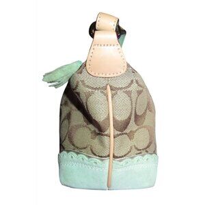 Embrace the Y2K trend with this Coach demi baguette in khaki canvas and seafoam green suede. Perfect for a touch of nostalgia and everyday elegance.