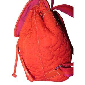 Vintage Coach backpack handbag, crafted from quilted nylon and leather. This unique red piece embodies Y2K style and offers a fashionable, functional option for carrying essentials.