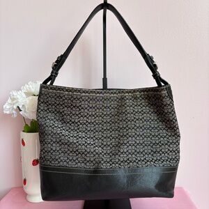 This Coach Peyton Collection F11666 tote features the iconic signature monogram canvas upper paired with a sleek black leather bottom for a stylish, durable finish.