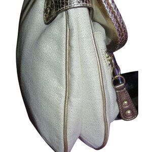 Limited Edition Coach Bleecker clutch with embossed exotic python design. Features a fold-over style with a kisslock closure, perfect for adding a touch of luxury to any outfit. Bag is ivory woven with soft metallic gold thread. Gorgeous purple satin interior, kiss lock closure, two additional front pockets and three interior pockets.