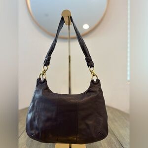 Sophisticated Coach shoulder bag in deep burgundy leather. Features gold-tone hardware purple interior lining and a sleek design. Very good condition.