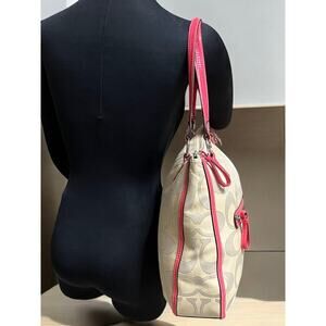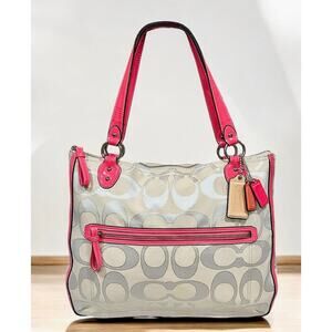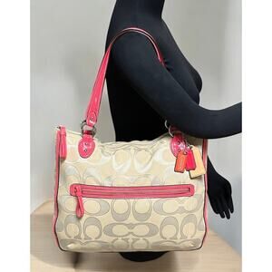 This Coach 22455 Hallie East West Metallic Signature Tote Bag and Wristlet from 2012 is such a great set! Featuring tan canvas with a metallic gold Signature print and coral patent leather trim, this large tote would make a great work bag or everyday tote. If you love the bright Coach styles from the mid 2000’s, this is a must have for your collection!