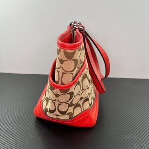 This authentic Coach tote bag combines practicality with style, featuring the iconic signature C print pattern in canvas and vibrant red leather accents.