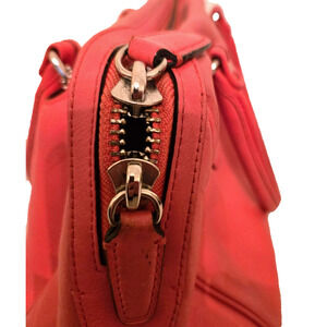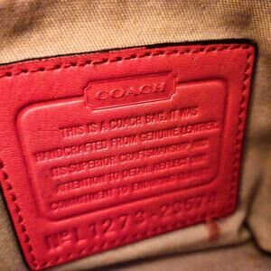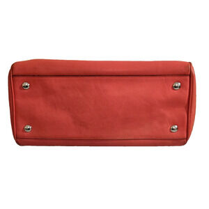 The Coach 23574 LEGACY HALEY SATCHEL in bright coral and silver is a classic rectangular satchel/top handle bag made of leather. It features a zip closure with silver hardware accents, double orange handles, and inner pockets for organization. This versatile bag is perfect for travel, casual outings, or business meetings, adding a touch of elegance with its timeless design and elegant details. The bag also comes with a detachable strap, bag charm, and original dust bag, making it a must-have accessory for any fashion-forward woman.