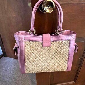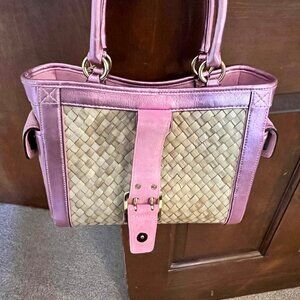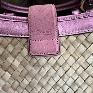 Coach Pink Woven Straw Tote Bag with Suede and Leather, Metallic Pink Trim