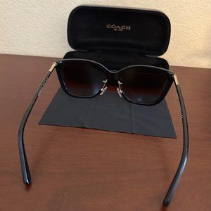Coach 0HC8345 black sunglasses, hard case, and cleaning cloth for sale. Dark gray gradient lenses with adjustable nose pads. Frame size 57x17x145. Excellent condition.